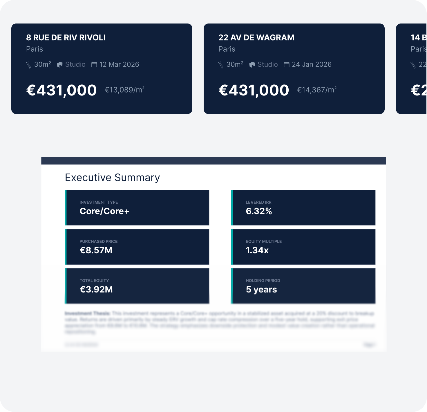 Currently, real estate investment data is rebuilt for every deal. Tools are disconnected and workflows are slow. Investment managers, developers, brokers and asset managers manually gather data, rebuild financial models and validate comparables before making investment decisions.